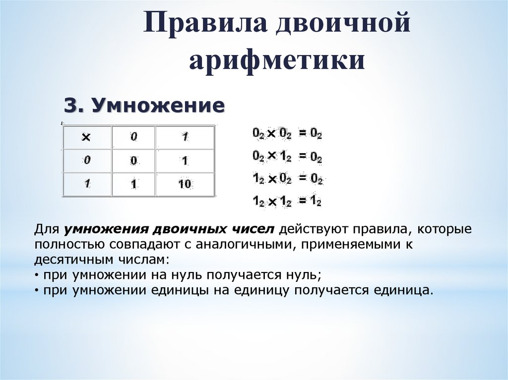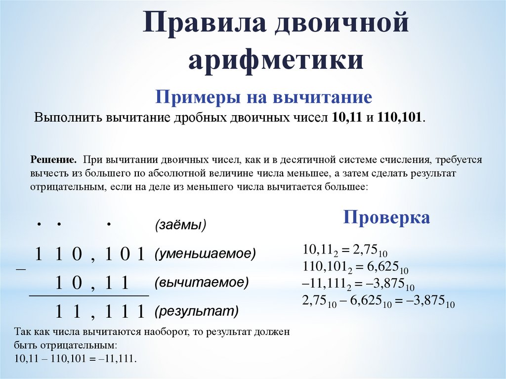 При вычитании двоичных чисел действуют правила, вытекающие из правил сложения: