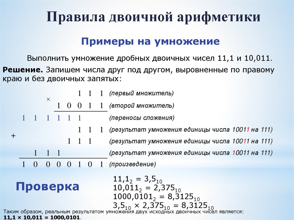 Выполнить умножение дробных двоичных чисел 11,1 и 10,011.