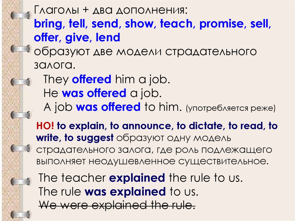Глаголы + два дополнения:bring, tell, send, show, teach, promise, sell,