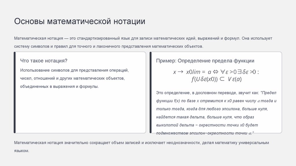 Основы математической нотацииМатематическая нотация — это стандартизированный язык для записи математических идей, выражений и формул. Она использует