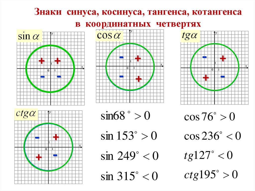 Знаки синуса, косинуса, тангенса, котангенсав координатных четвертях