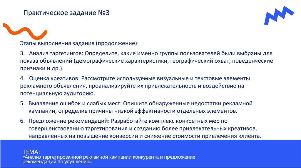 Этапы выполнения задания (продолжение):3. Анализ таргетингов: Определите, какие именно группы пользователей были выбраны для