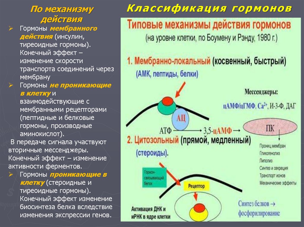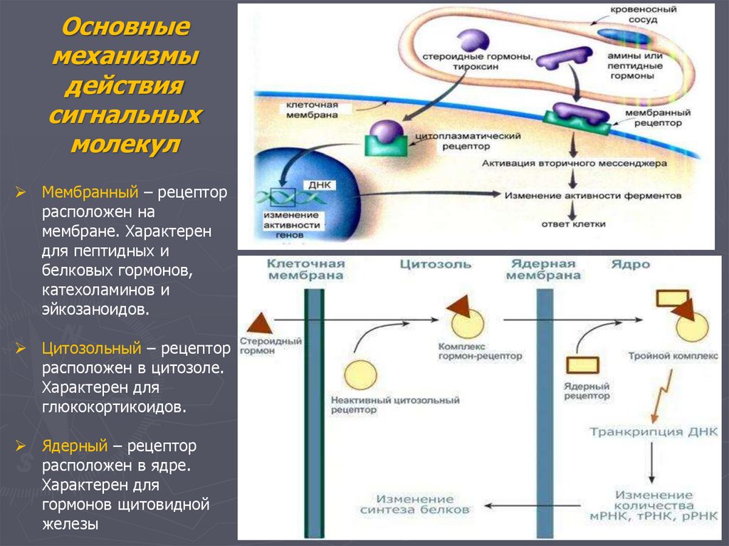 сигнал на внутриклеточные белки. Большинство гормонов действуют именно по данному механизму.