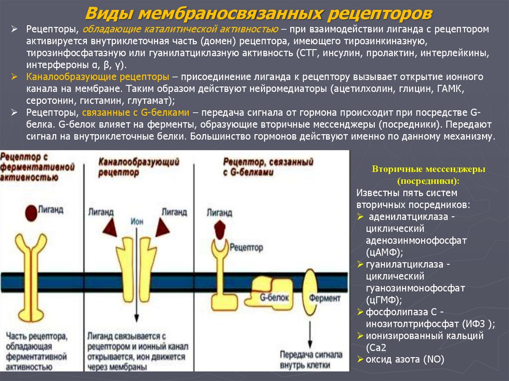 Рецепторы, связанные с G-белками – передача сигнала от гормона происходит при посредстве Gбелка. G-белок влияет на ферменты, образующие вторичные мессенджеры (посредники). Передают