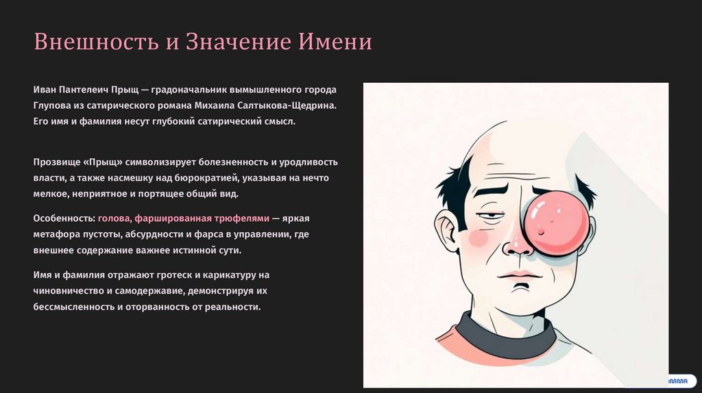 Внешность и Значение ИмениИван Пантелеич Прыщ — градоначальник вымышленного города