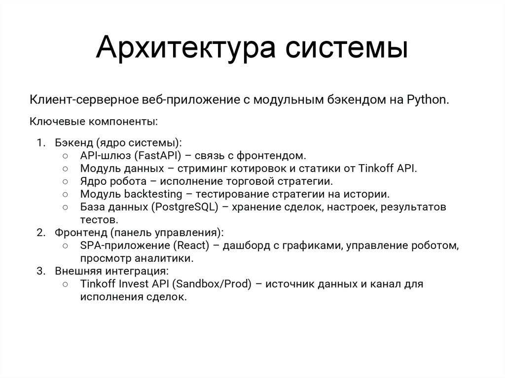 Архитектура системыКлиент-серверное веб-приложение с модульным бэкендом на Python.