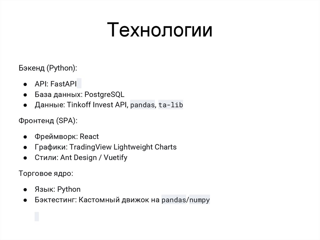 ● Данные: Tinkoff Invest API, pandas, ta-lib