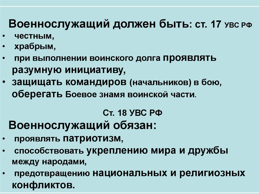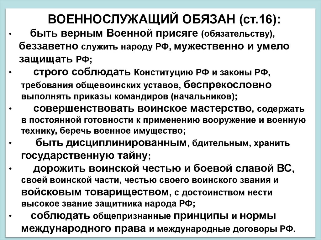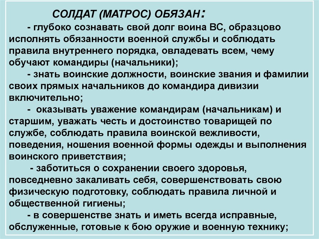 СОЛДАТ (МАТРОС) ОБЯЗАН:- глубоко сознавать свой долг воина ВС, образцово