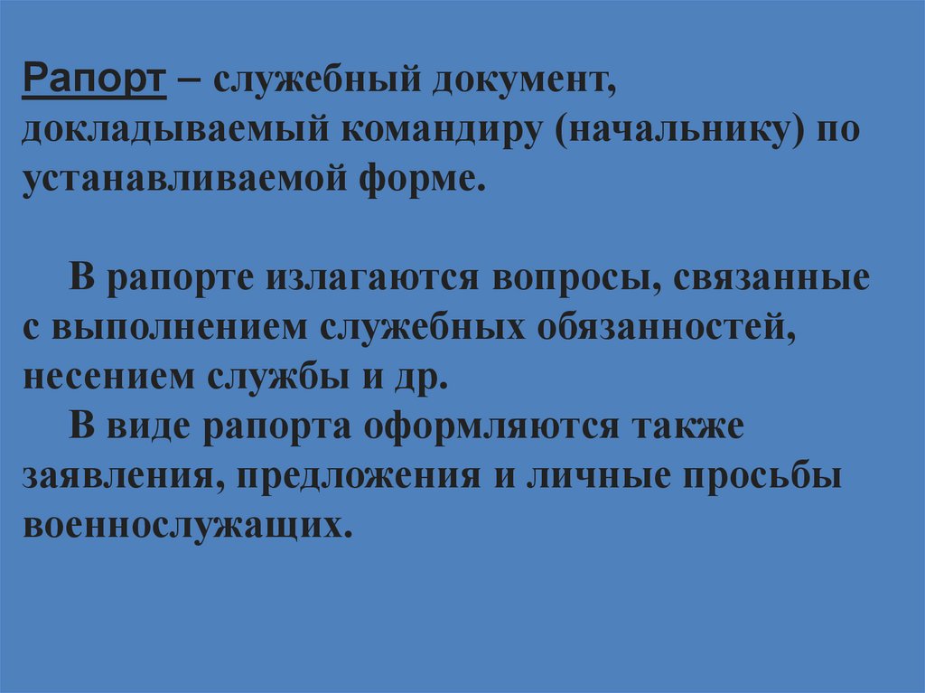 Рапорт – служебный документ,докладываемый командиру (начальнику) по