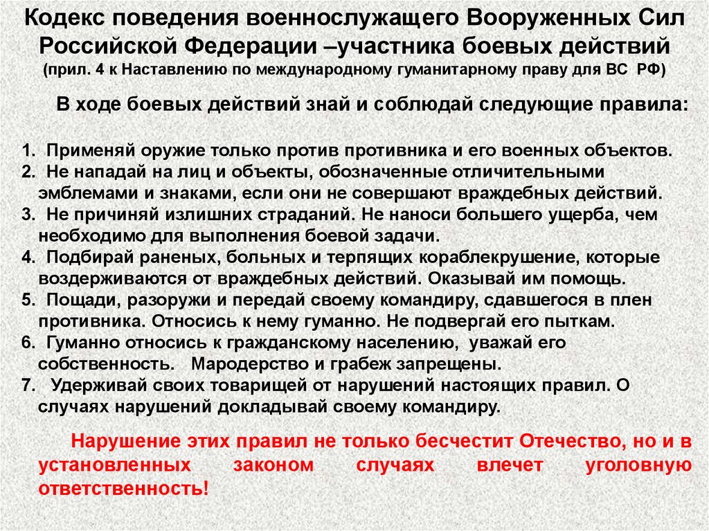 Кодекс поведения военнослужащего Вооруженных СилРоссийской Федерации –участника боевых действий