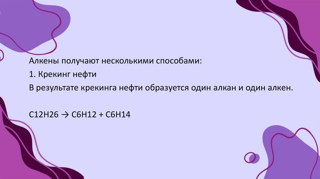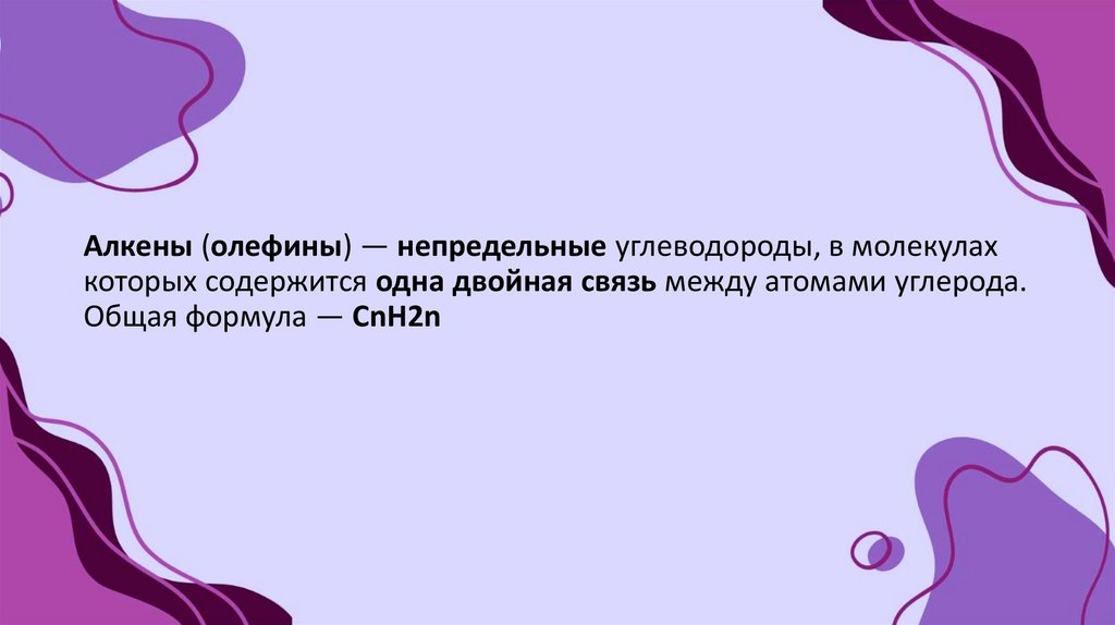 Алкены (олефины) — непредельные углеводороды, в молекулахкоторых содержится одна двойная связь между атомами углерода.