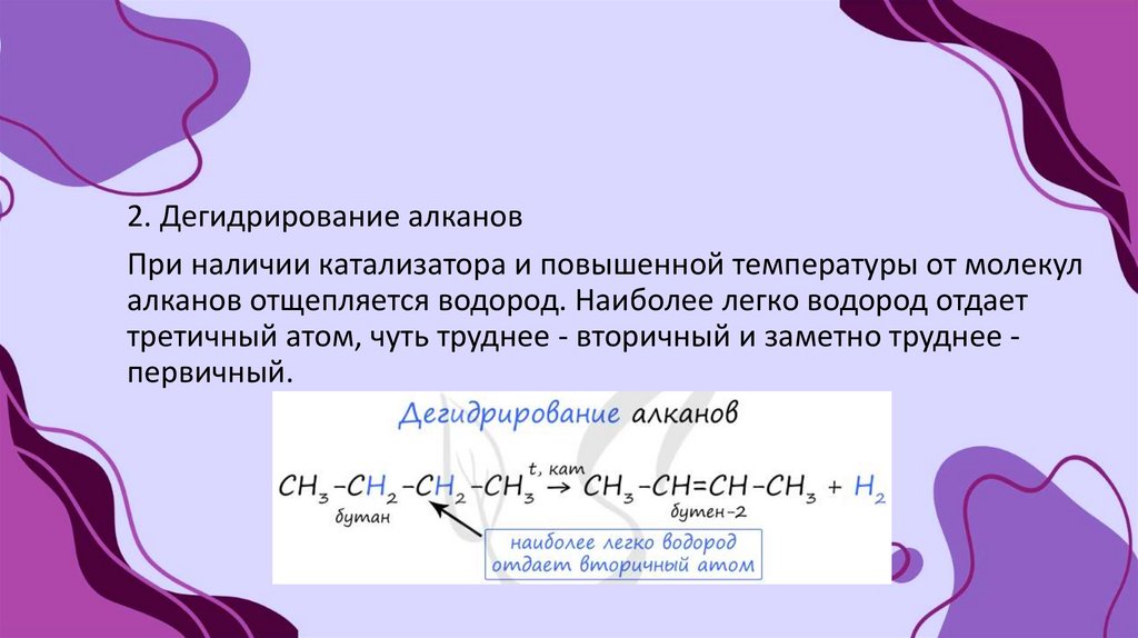 2. Дегидрирование алкановПри наличии катализатора и повышенной температуры от молекул