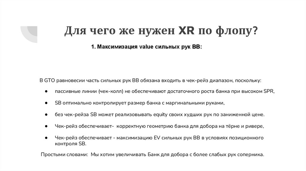 Для чего же нужен XR по флопу?1. Максимизация value сильных рук BB: