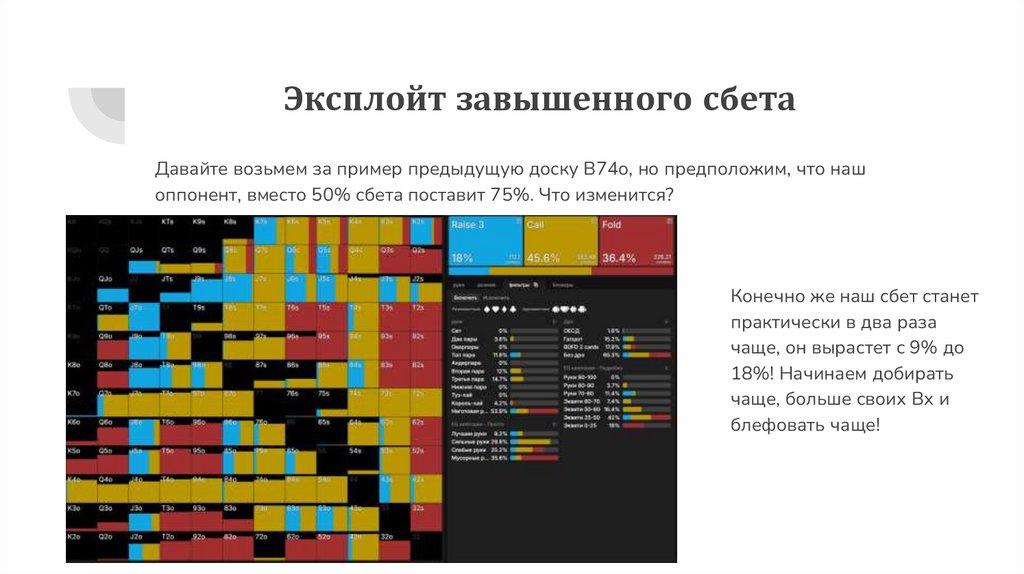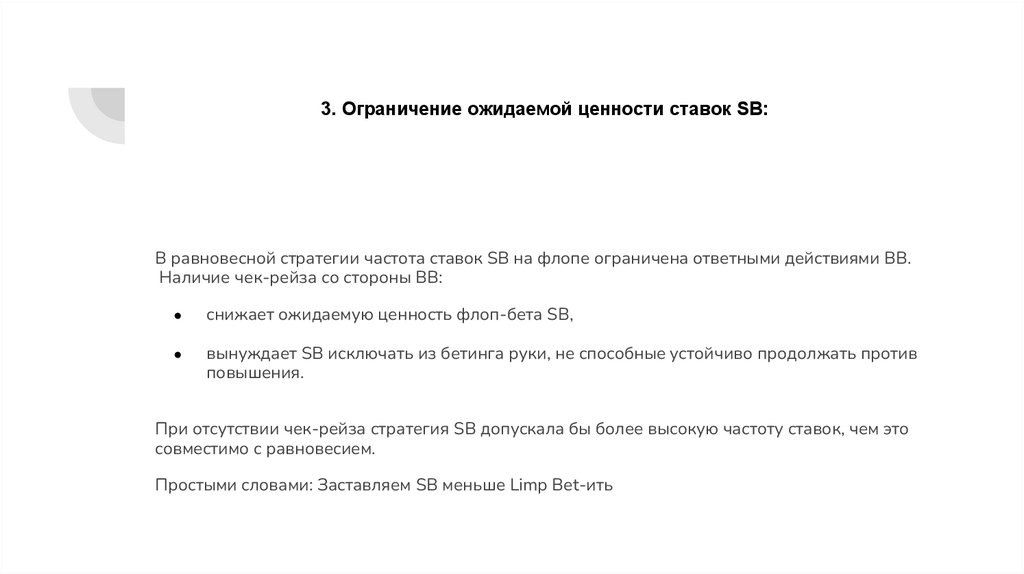 3. Ограничение ожидаемой ценности ставок SB:В равновесной стратегии частота ставок SB на флопе ограничена ответными действиями BB.