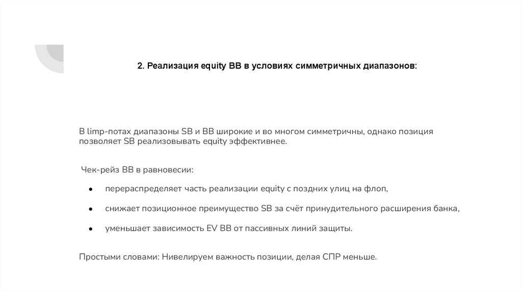 2. Реализация equity BB в условиях симметричных диапазонов:В limp-потах диапазоны SB и BB широкие и во многом симметричны, однако позиция