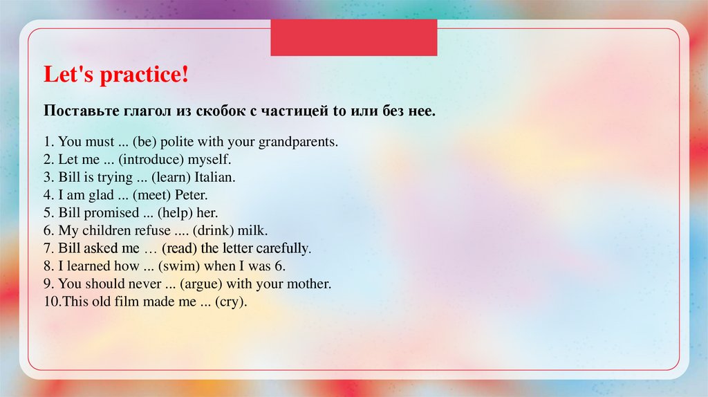 Let's practice!Поставьте глагол из скобок с частицей to или без нее.