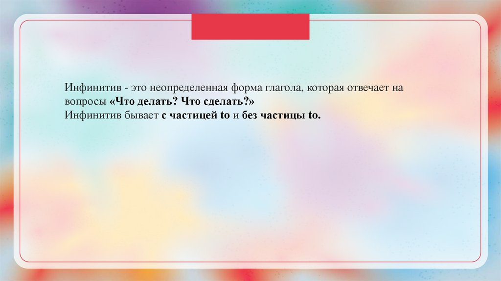 Инфинитив - это неопределенная форма глагола, которая отвечает навопросы «Что делать? Что сделать?»
