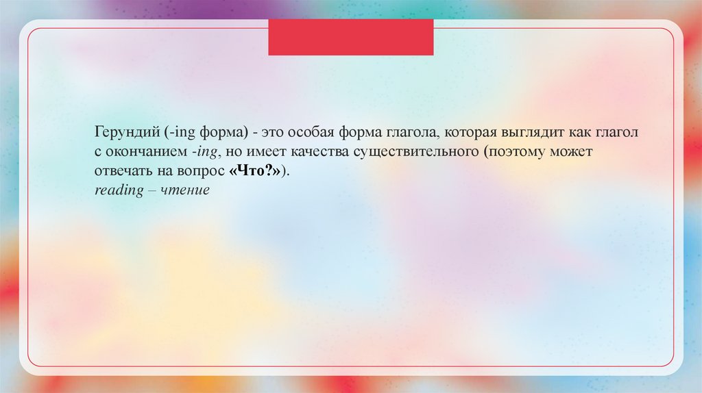 Герундий (-ing форма) - это особая форма глагола, которая выглядит как глаголс окончанием -ing, но имеет качества существительного (поэтому может