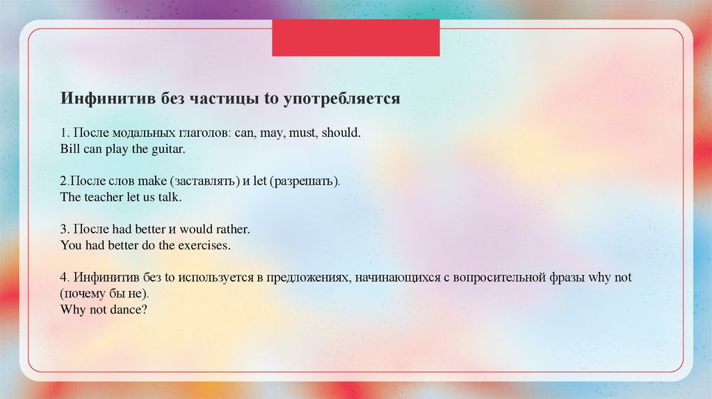 Инфинитив без частицы to употребляется1. После модальных глаголов: can, may, must, should.