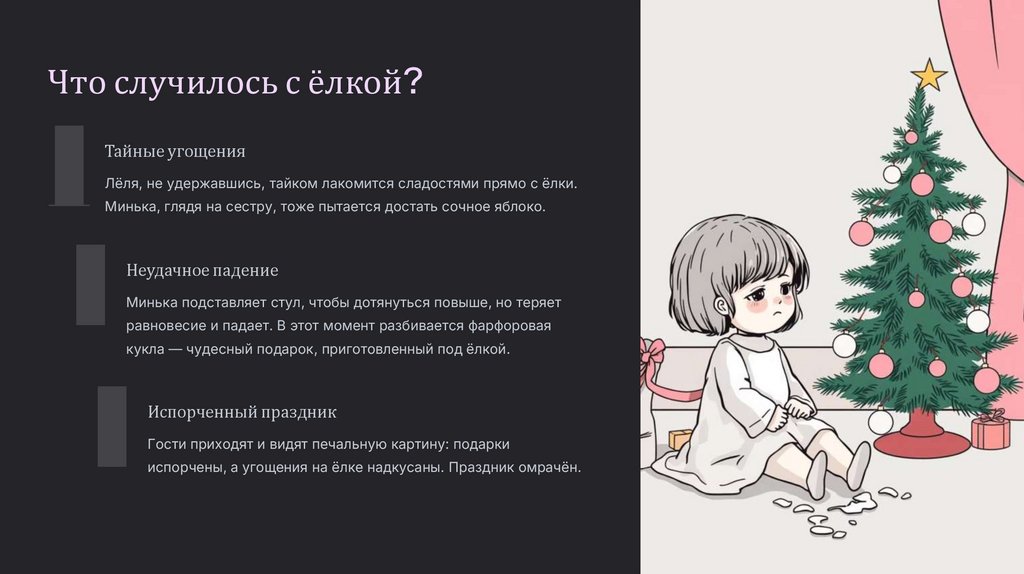 испорчены, а угощения на ёлке надкусаны. Праздник омрачён.
