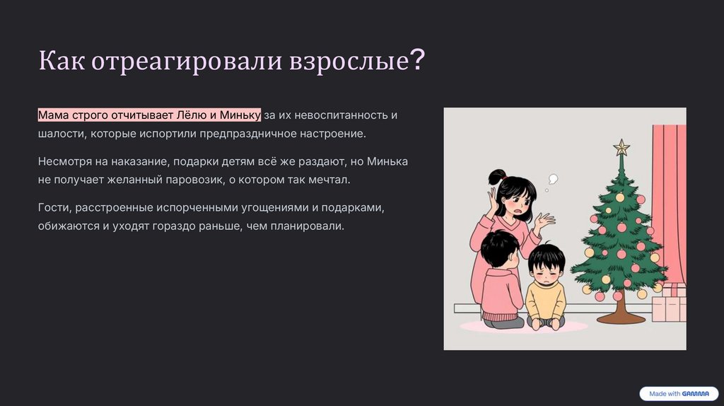 Как отреагировали взрослые?Мама строго отчитывает Лёлю и Миньку за их невоспитанность и