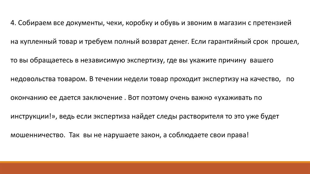 4. Собираем все документы, чеки, коробку и обувь и звоним в магазин с претензиейна купленный товар и требуем полный возврат денег. Если гарантийный срок прошел,
