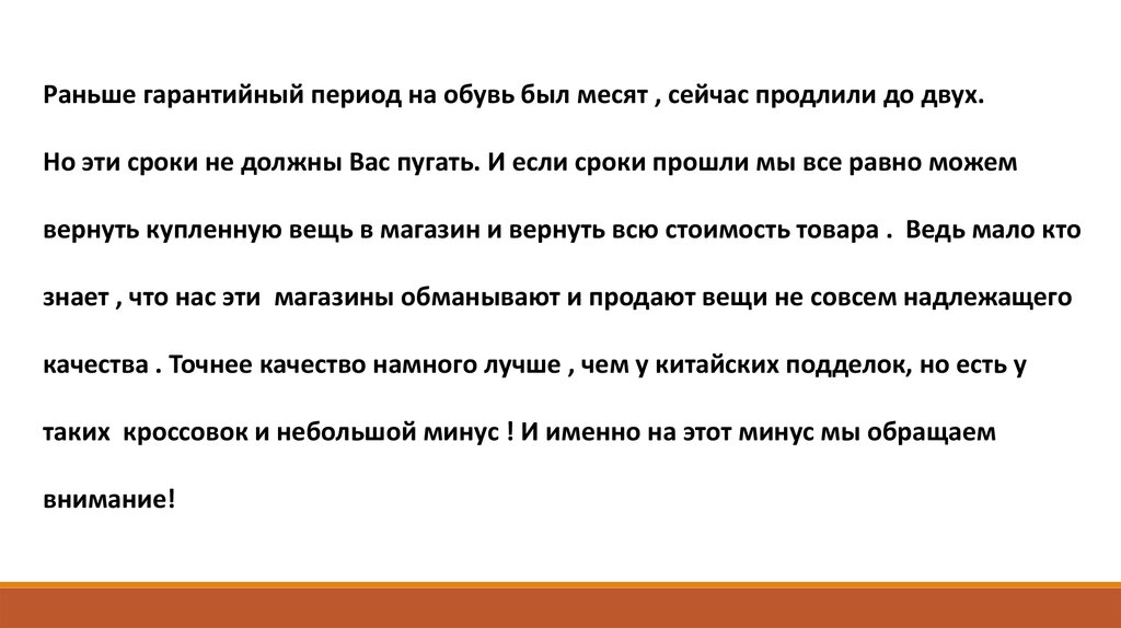Раньше гарантийный период на обувь был месят , сейчас продлили до двух.Но эти сроки не должны Вас пугать. И если сроки прошли мы все равно можем