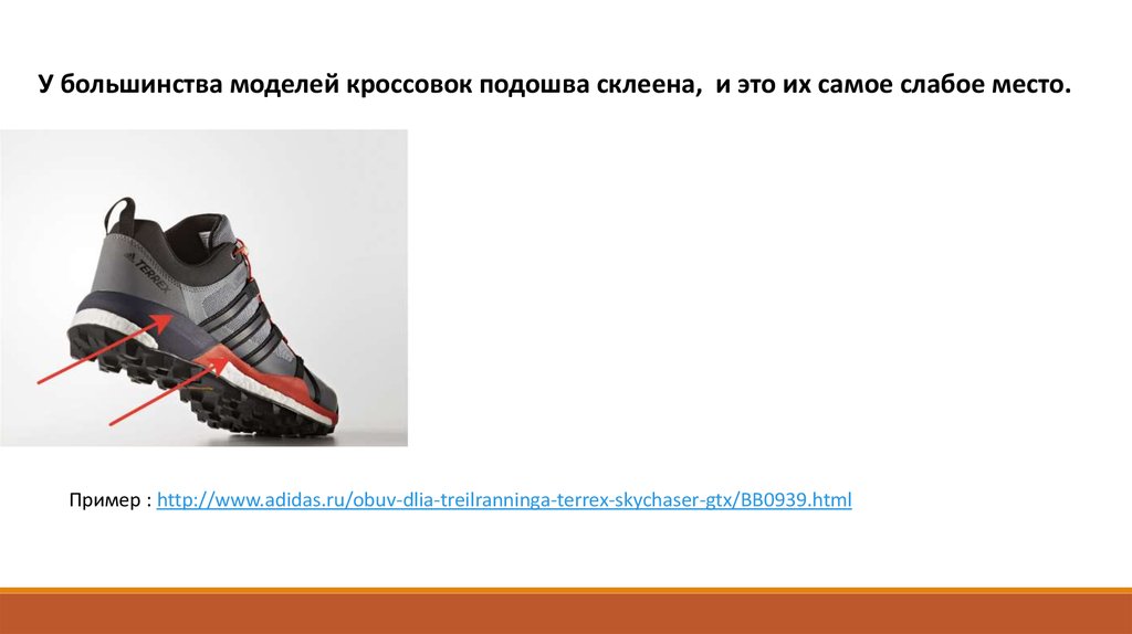 У большинства моделей кроссовок подошва склеена, и это их самое слабое место.Пример : http://www.adidas.ru/obuv-dlia-treilranninga-terrex-skychaser-gtx/BB0939.html