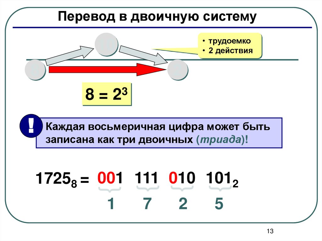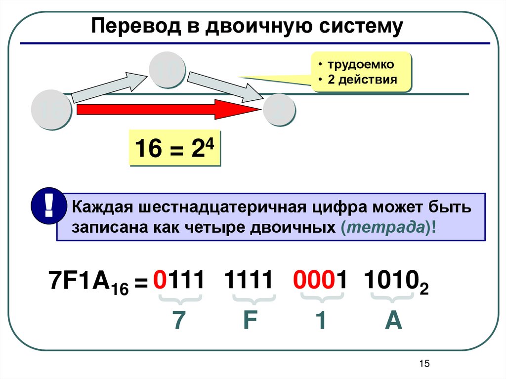 Перевод в двоичную систему• трудоемко
