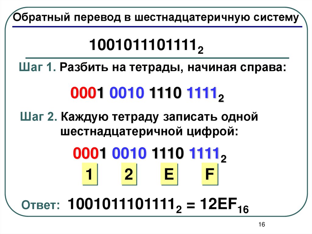 Ответ: 10010111011112 = 12EF16