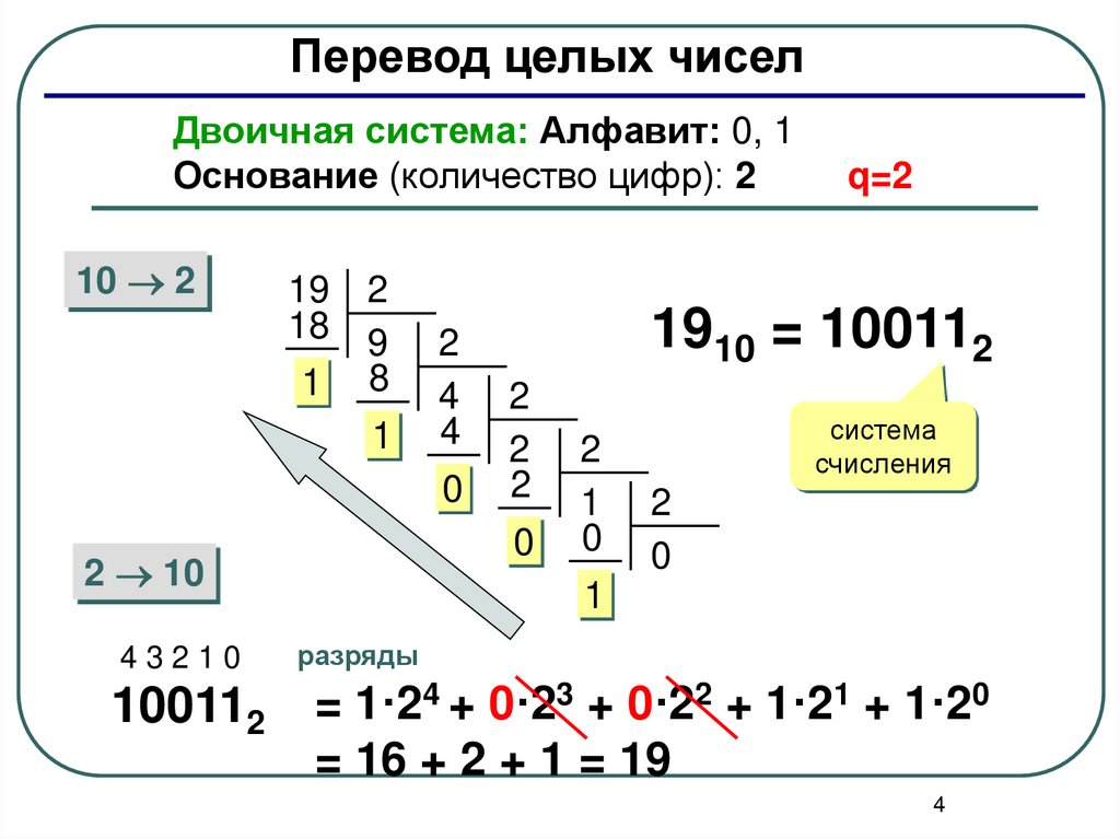 Перевод целых чиселДвоичная система: Алфавит: 0, 1