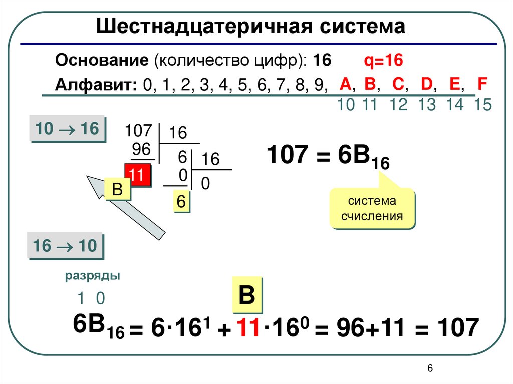 6B16 = 6·161 + 11·160 = 96+11 = 107