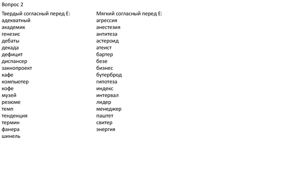 Вопрос 2Твердый согласный перед Е: