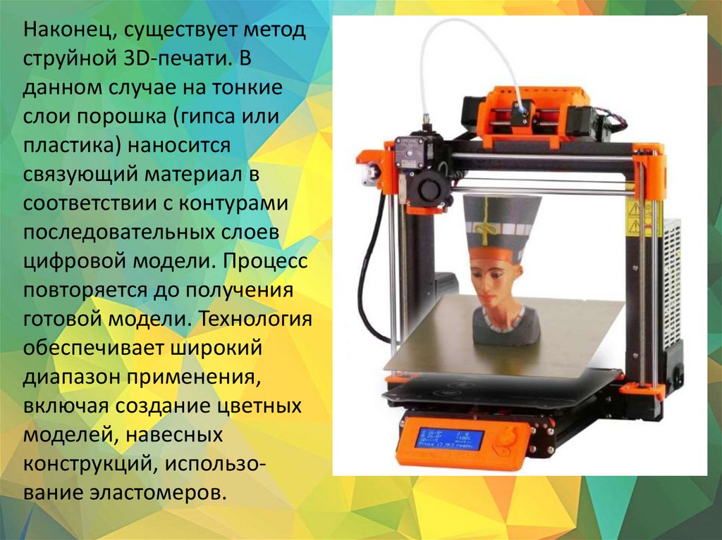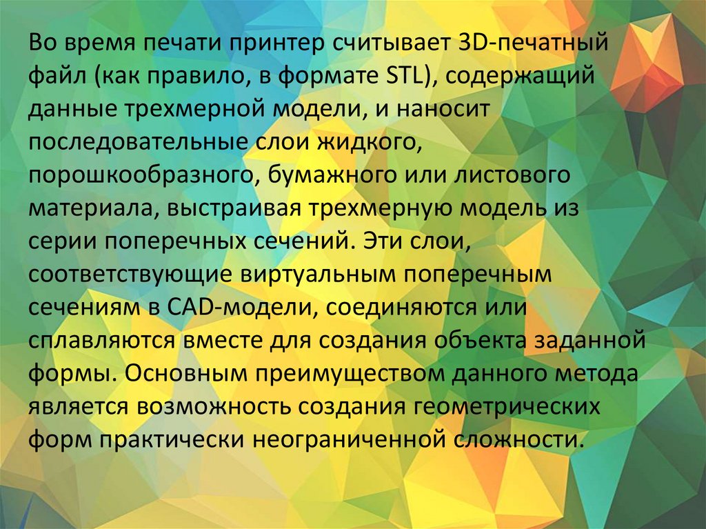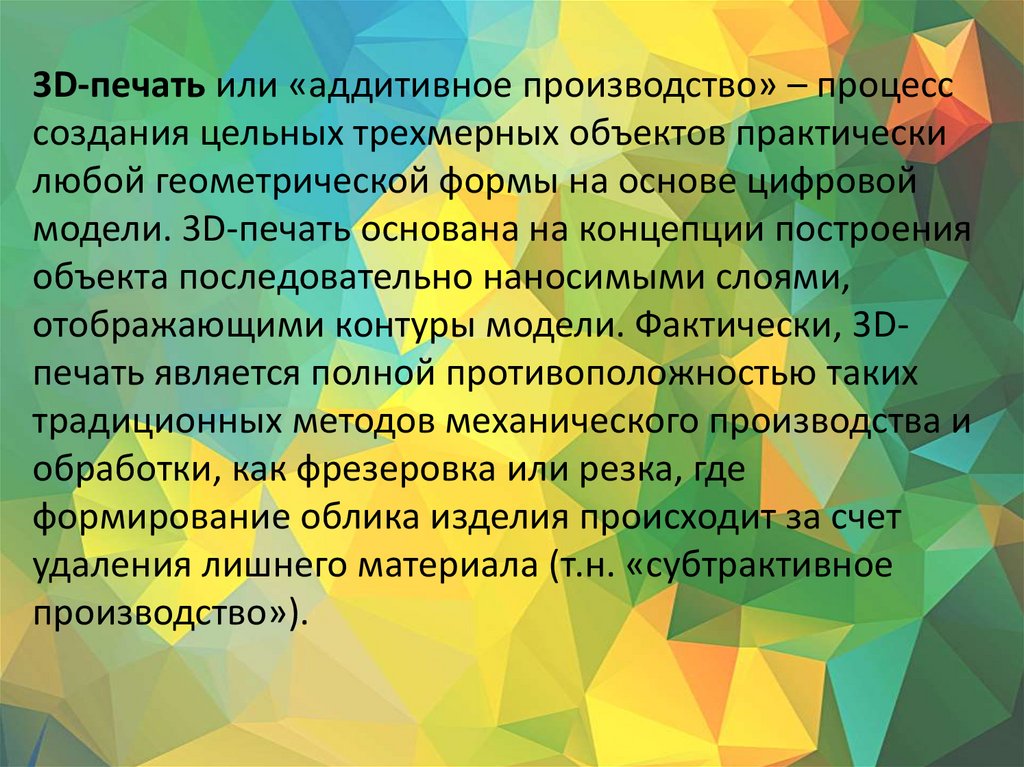 3D-печать или «аддитивное производство» – процесссоздания цельных трехмерных объектов практически