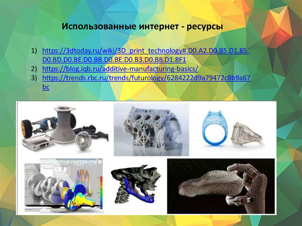 Использованные интернет - ресурсы1) https://3dtoday.ru/wiki/3D_print_technology#.D0.A2.D0.B5.D1.85.
