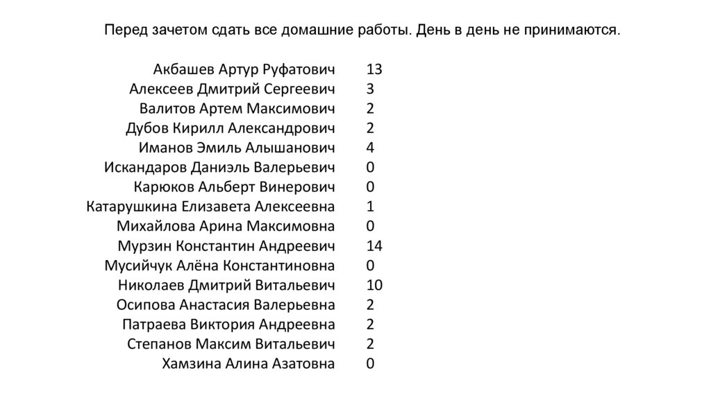Перед зачетом сдать все домашние работы. День в день не принимаются.Акбашев Артур Руфатович