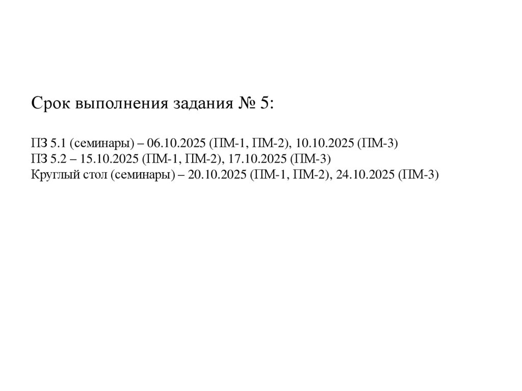 Срок выполнения задания № 5:ПЗ 5.1 (семинары) – 06.10.2025 (ПМ-1, ПМ-2), 10.10.2025 (ПМ-3)