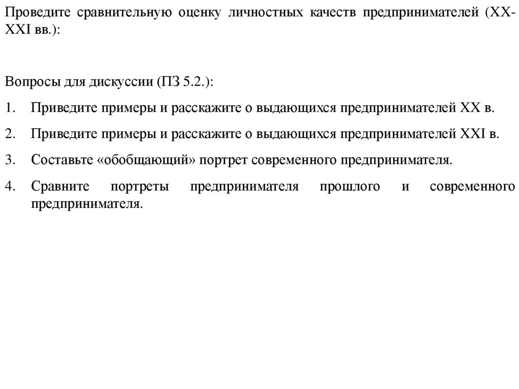 Проведите сравнительную оценку личностных качеств предпринимателей (XXXXI вв.):Вопросы для дискуссии (ПЗ 5.2.):