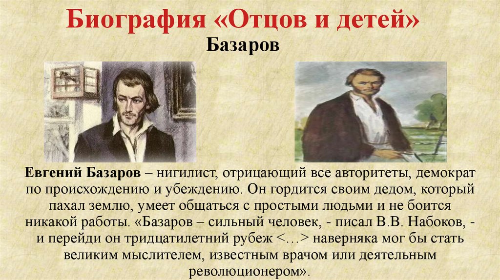 никакой работы. «Базаров – сильный человек, - писал В.В. Набоков, и перейди он тридцатилетний рубеж <…> наверняка мог бы стать