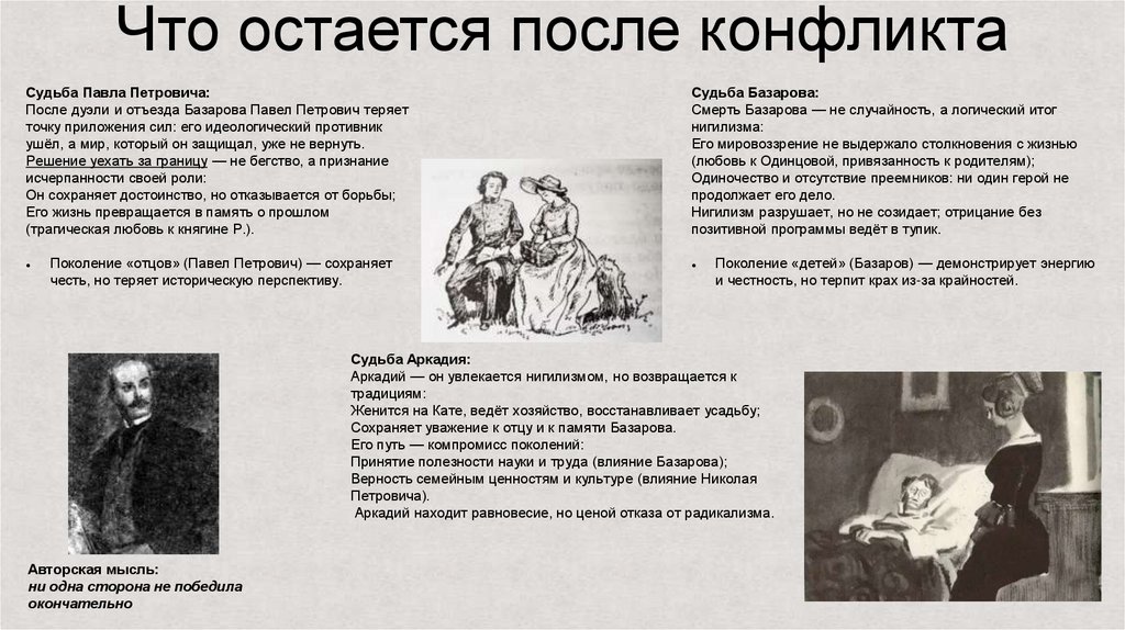 Трагедию Павла Петровича (потеря смысла, эмиграция); трагедию Базарова (одиночество, смерть); надежду в лице Аркадия