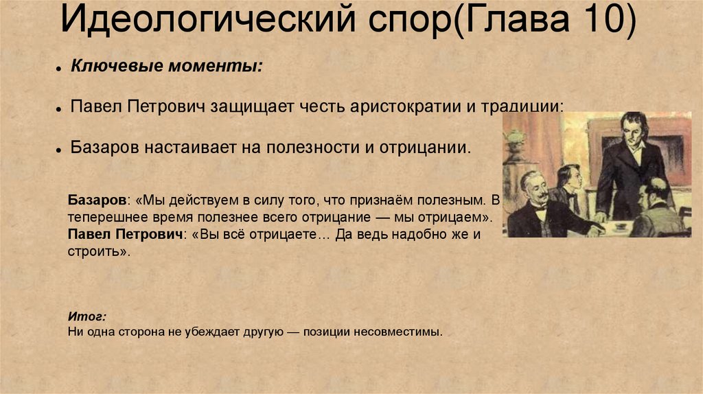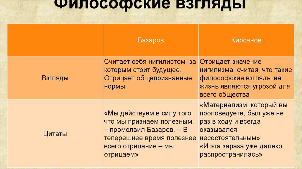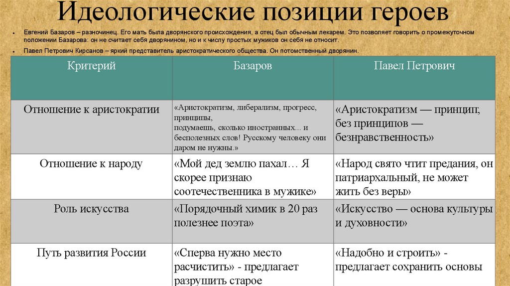 Идеологические позиции героевЕвгений Базаров – разночинец. Его мать была дворянского происхождения, а отец был обычным лекарем. Это позволяет говорить о промежуточном