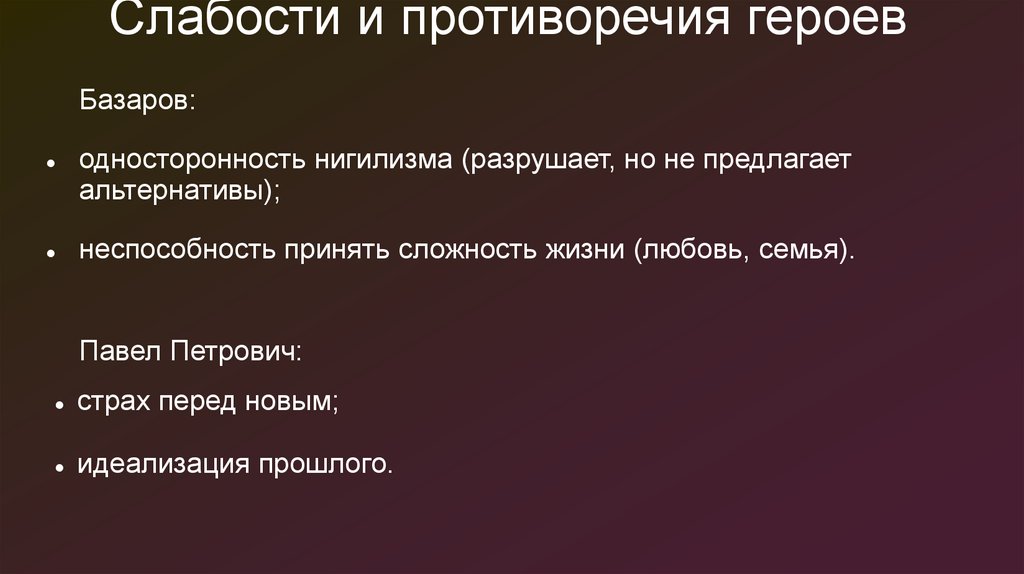 Сильные и слабые стороны «детей» (Базарова): энергия и готовность к переменам; вера в науку и практический разум; честность в