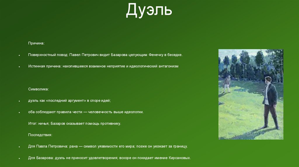 Для Базарова: дуэль не приносит удовлетворения; вскоре он покидает имение Кирсановых.