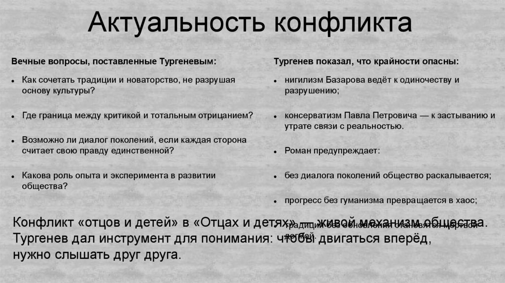 Актуальность конфликтаВечные вопросы, поставленные Тургеневым: