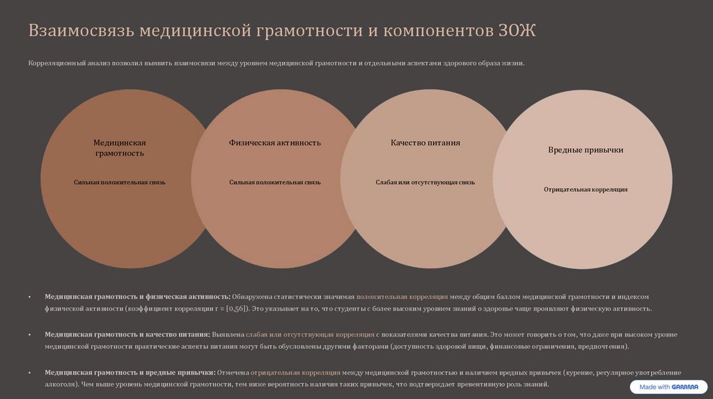 Взаимосвязь медицинской грамотности и компонентов ЗОЖКорреляционный анализ позволил выявить взаимосвязи между уровнем медицинской грамотности и отдельными аспектами здорового образа жизни.