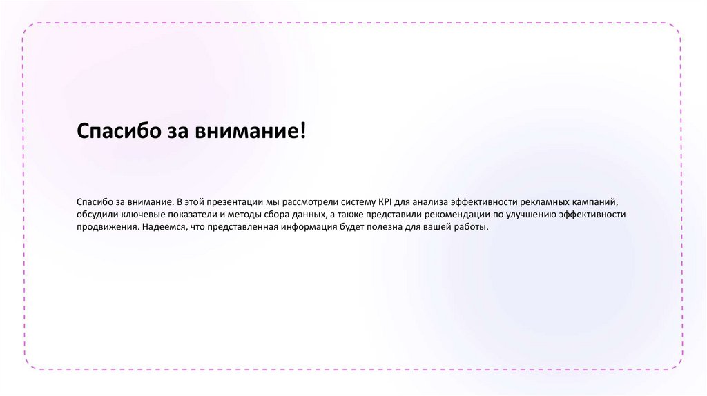 Спасибо за внимание!Спасибо за внимание. В этой презентации мы рассмотрели систему КРІ для анализа эффективности рекламных кампаний,
