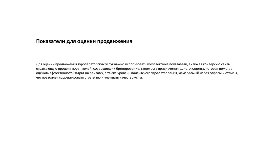 Показатели для оценки продвиженияДля оценки продвижения туроператорских услуг важно использовать комплексные показатели, включая конверсию сайта,