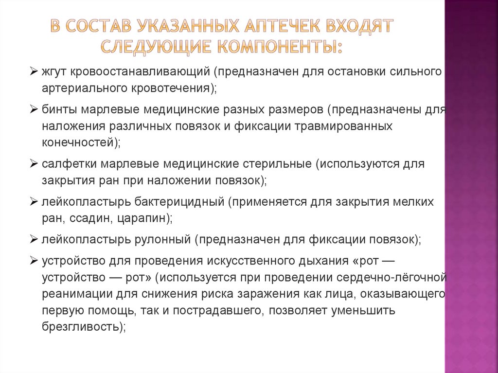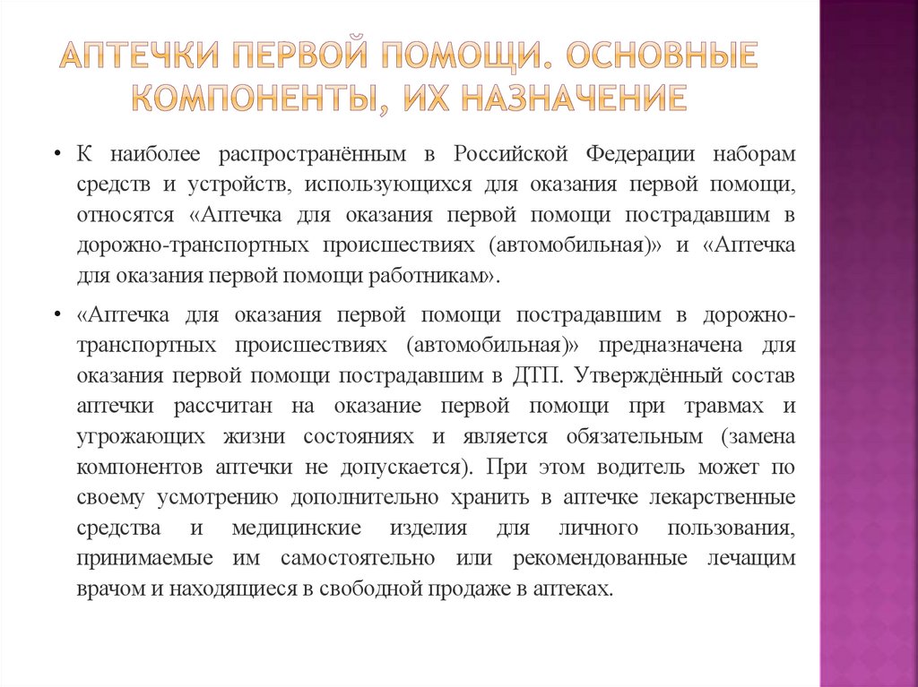 • «Аптечка для оказания первой помощи пострадавшим в дорожнотранспортных происшествиях (автомобильная)» предназначена для