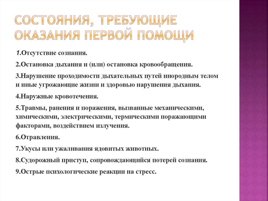 1.Отсутствие сознания.2.Остановка дыхания и (или) остановка кровообращения.