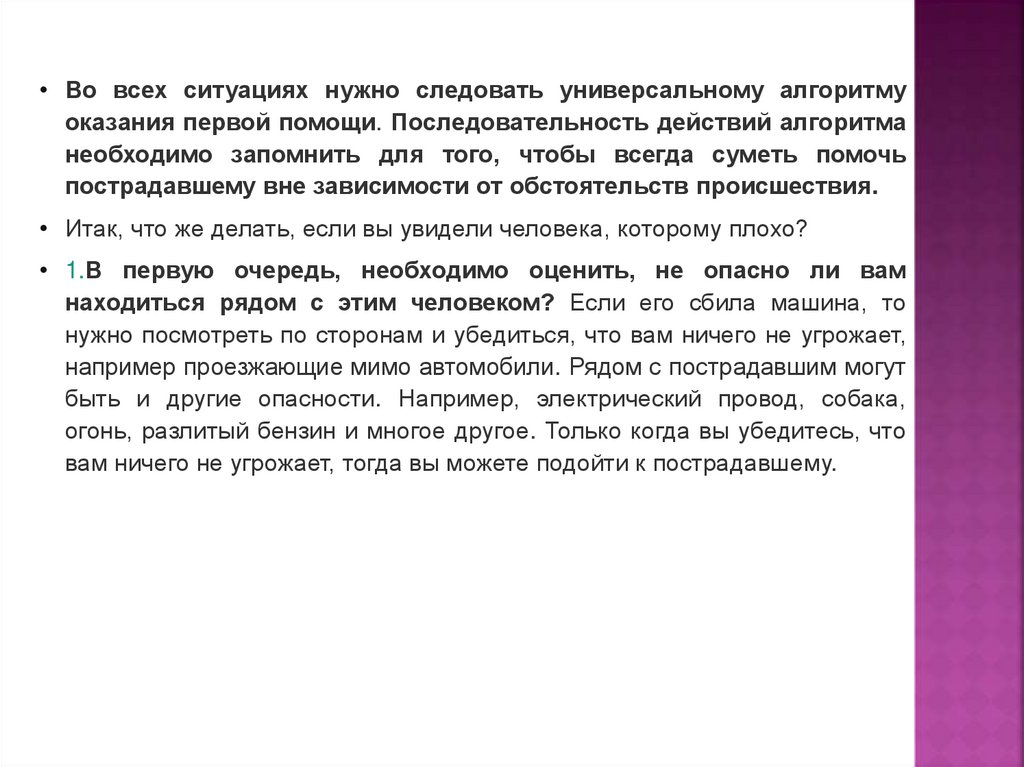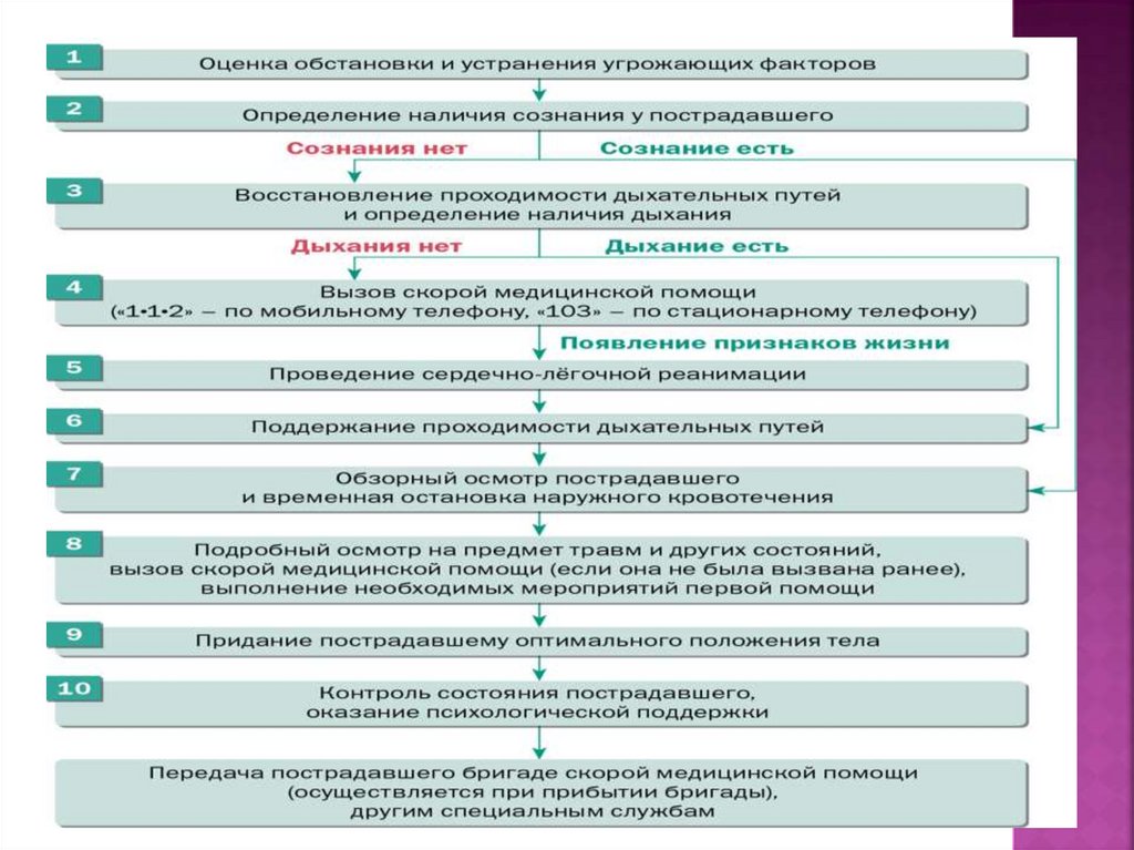 • Во всех ситуациях нужно следовать универсальному алгоритмуоказания первой помощи. Последовательность действий алгоритма